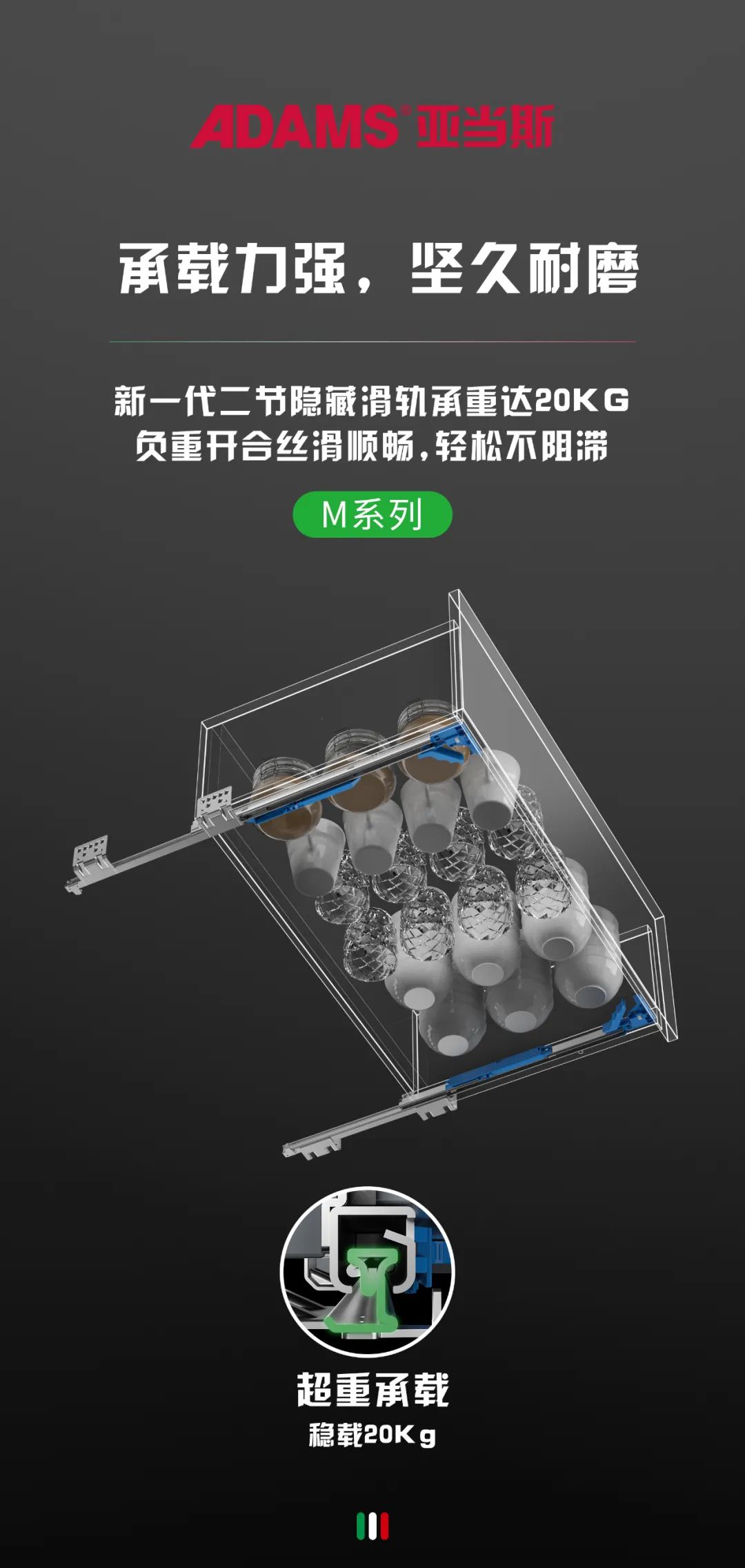 美好生活由此開啟,負重推拉不費力,亞當斯M系列二節隱藏軌能承重達20kg,平穩堅固。