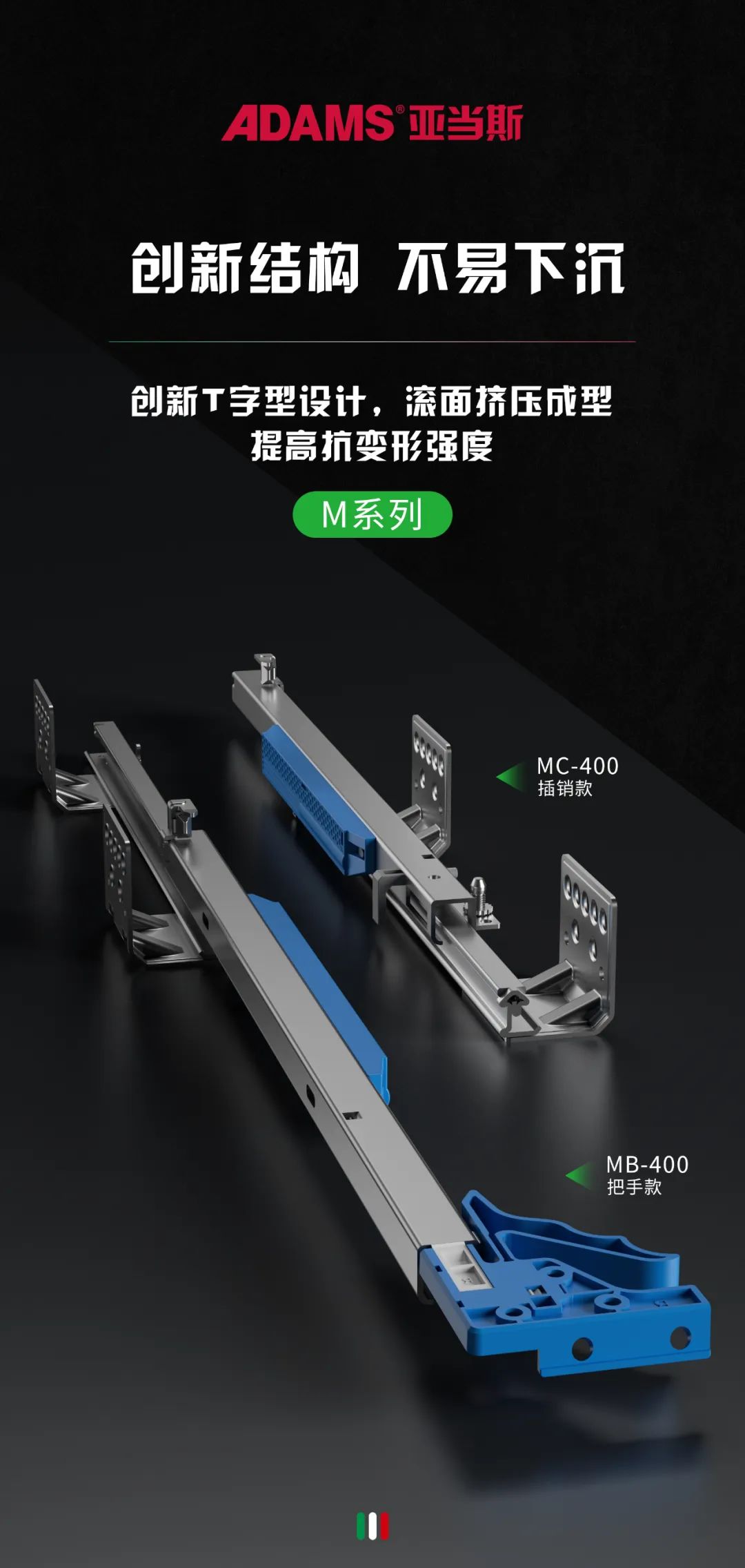 亞當斯M系列二節隱藏滑軌分為:把手款和插銷款,根據家具安裝需求選擇最佳的抽屜搭檔即可,適配多種柜體,裝卸簡單省時提效。
