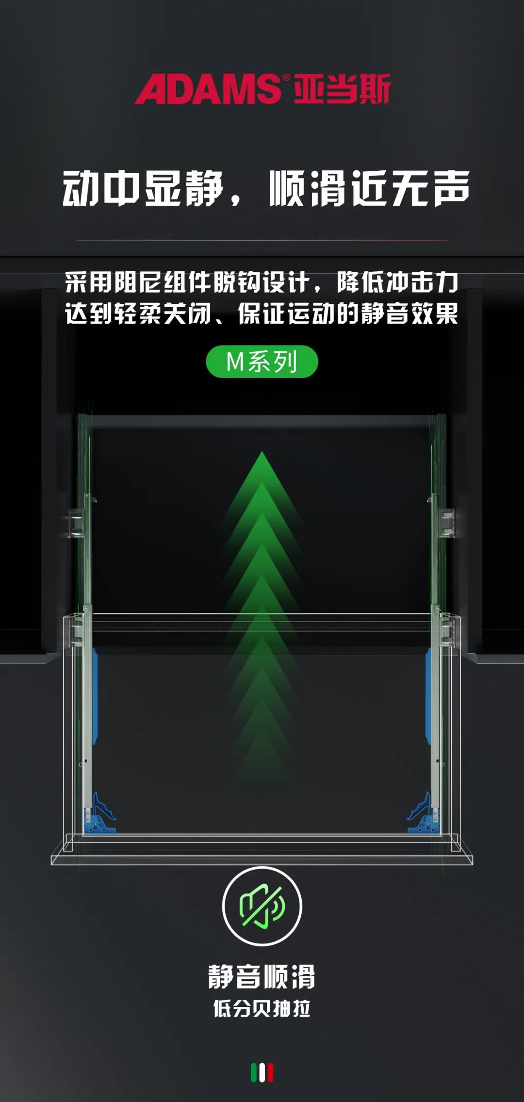 亞當斯M系列二節隱藏滑軌采用高壓油缸、阻尼組件脫鉤設計,運動過程緩沖卸力,防撞耐用兼平穩、無懼卡頓。